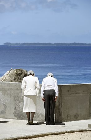 パラオ共和国のペリリュー島の最南端に立つ「西太平洋戦没者の碑」の先から、約10キロ離れたアンガウル島に向かって黙礼される天皇皇后両陛下。