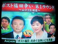 「そうですね。ま、その、中国から見たらそう見えるってことで、この連帯関係は今はかなり強いわけですね。で、じゃあその、小池さんの方は誰かっていうことですね。これは先週実はもうお話ししましたけれども、まず小泉さんがいると。で、小泉さんは郵政民営化しかあいかわらず関心がない人だから、小池さんは刺客第1号になった人だから、郵政民営化の完全な仕上げまで全部やってくれる総理になるんじゃないかと。そして、ここに古賀さんがいるんですが、古賀さんは置きようがないからここに置いたんで。その、古賀さんをどこに置いたらいいか、まだよく分からない。つまり古賀さんは、はっきり言うと非常にしたたかな人でもありますから、今、様子を見てる。とりあえず小泉政権時代には古賀さんは非常に苦しめられたわけですけど、当面はその、小泉さんとくっついて、くっついて、小池さんを支持してるように見える。まだとても決めてると思いませんが、それどうしてかというと、実は古賀さんというのは、今の福田総理をある意味、上回るほどの親中派ですから。この麻生さんだけは困るというのがあるので、今のところこっち側についてるってことなんですね。で、こうやって見てくると、それぞれ応援演説に入ってもですね、行く意味が違うということはわかっていただけると思うんですが、じゃあさっき言いました選挙の結果、4月27日日曜日の夜にもう間もなく結果出ますんで、その結果によってどうなるかを、ちょっと見てみたいと思います」
